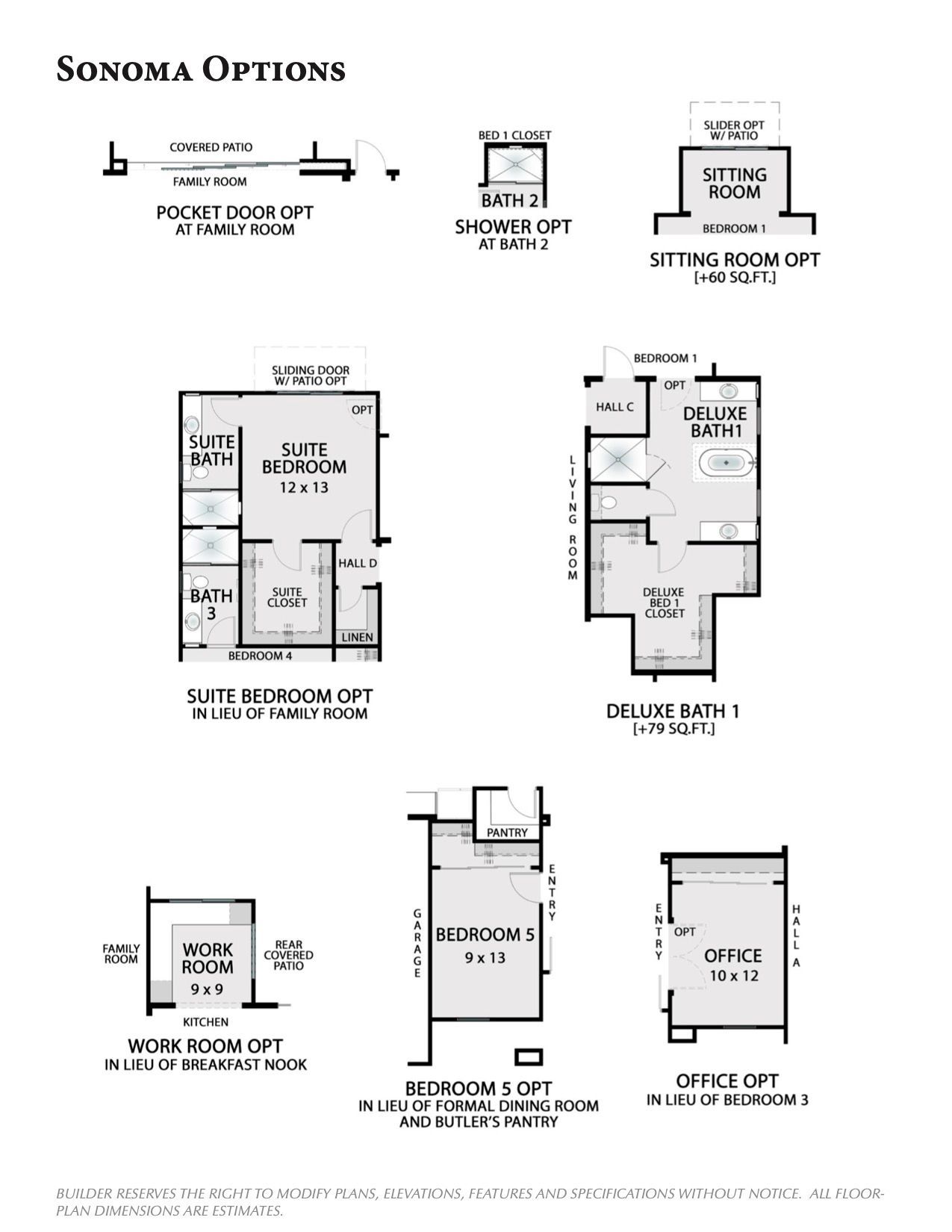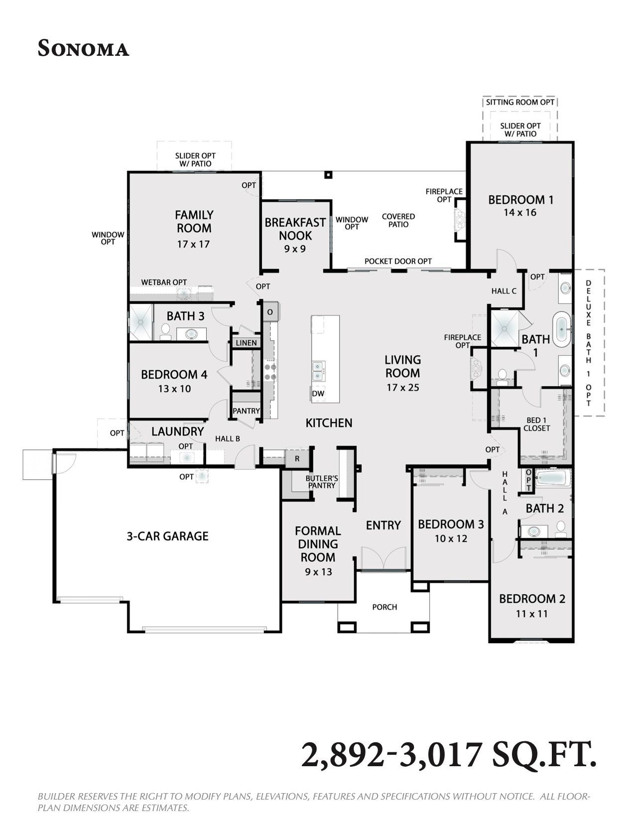The Sonoma plan starts at 2,892 sq.ft. and has both a Formal Living room and a separate Family Room. This four bedroom, 3 bathroom home comes standard with a 3-car garage. There are many options to customize this home further, such as adding a 5th Bedroom, the Sitting Room, Work Room, or the Suite Bedroom.