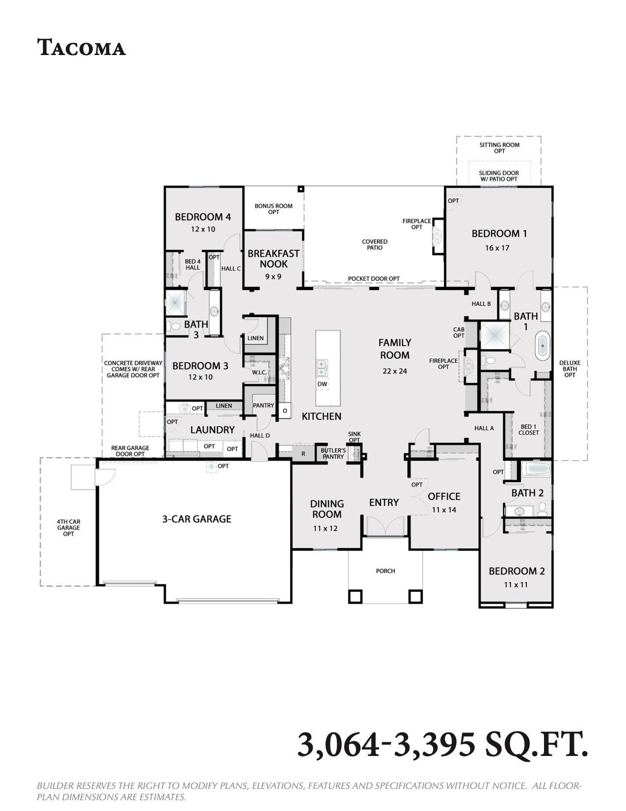 Explore the Tacoma plan, a spacious 3,064 sq. ft. home featuring 4 bedrooms, 3 baths, and a 3-car garage. This versatile design includes a breakfast nook, formal dining room, and office. Upgrade options include a 5th bedroom, sitting room, bonus room, and deluxe bath. Choose from three stylish elevations: Spanish, Farmhouse, or Contemporary.